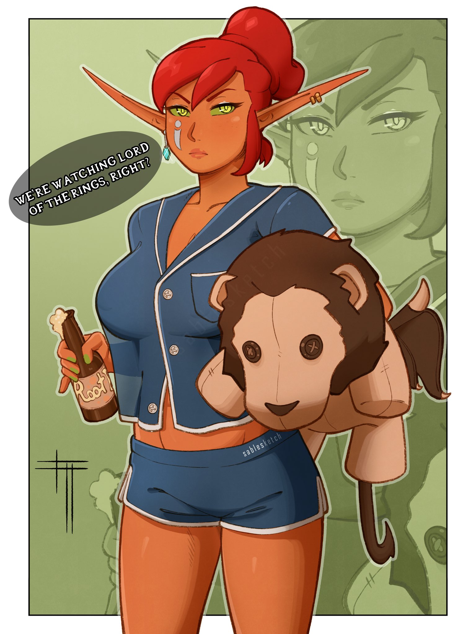 1girlartist logoartist namebeer bottleblue pajamasblue shirtblue shortsbottlebreastscleavagecollarbonecolored scleracolored skinearringselfenglish textgreen eyesgreen scleraholdingholding bottlehuge breastsjewelrylarge breastslipslogolong hairorange skinpajamaspartially unbuttonedpointy earsred hairsablesketchshiny skinshirtshortssolospeech bubblestuffed animalstuffed toyvi (sablesketch)