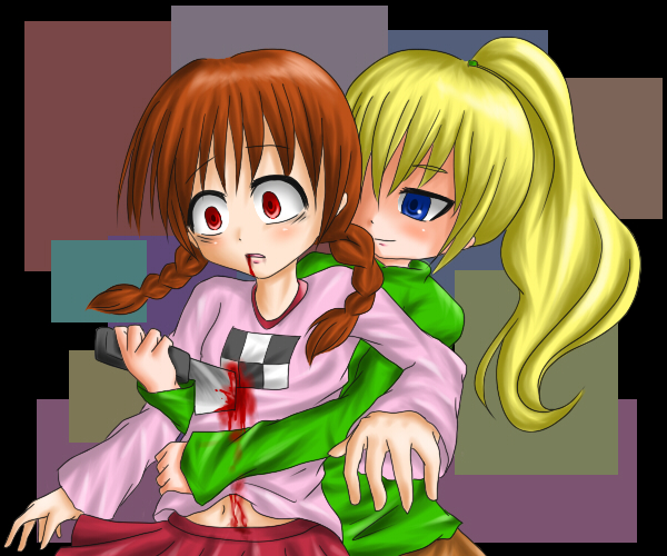 2girlsbad endbags under eyesblonde hairbloodblue eyesbraidbrown hairgreen shirtgurohugkitchen knifeknifelong hairmidriffmultiple girlsmurderpink shirtponytailpurple skirtraised eyebrowsred eyesshirtskirtstabtwin braidstwintails