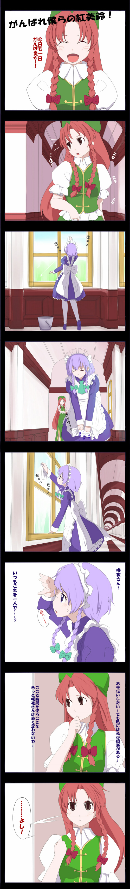 blue eyesblushbraidbrown eyesclenched handcomicfemale focushairbandhatlong hairmaidpurple hairred hairribbontwin braids