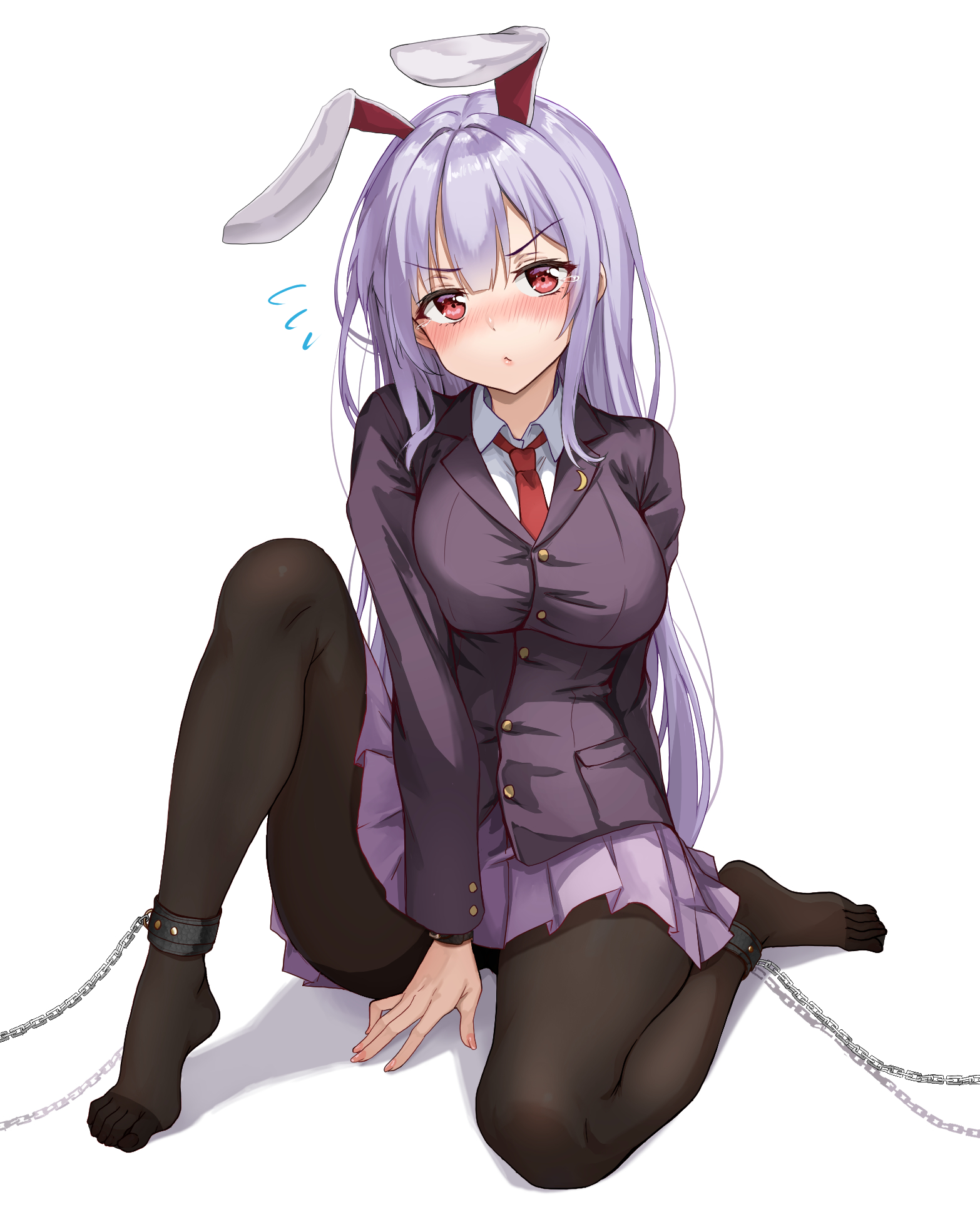 1girladapted costumeanimal earsblack jacketblack pantyhoseblazerblushbreastschained legscollared shirtdress shirtfeetflying sweatdropsfull bodygrey skirtjacketlarge breastslong hairlooking at viewerminiskirtnecktieno shoesnose blushpantyhosepink eyespleated skirtpurple hairrabbit earsrabbit girlred necktieschool uniformshirtsimple backgroundskirtsolotiptoestoesv-shaped eyebrowsvery long hairwhite backgroundwhite shirt