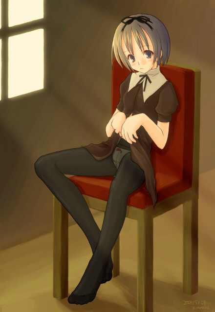 1girlchairclothes liftcrotch seamfeetfemale focuson chairpantiespanties under pantyhosepantyhoseschool uniformshort hairskirtskirt liftsolounderwearupskirt
