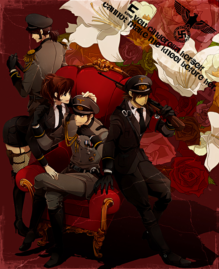 ryp, roberta (black lagoon), black lagoon, 00s, 1girl, apron, braid, combat maid, cross, female focus, glasses, glock, gun, handgun, latin cross, maid, maid apron, opaque glasses, pistol, red eyes, solo, twin braids, weapon