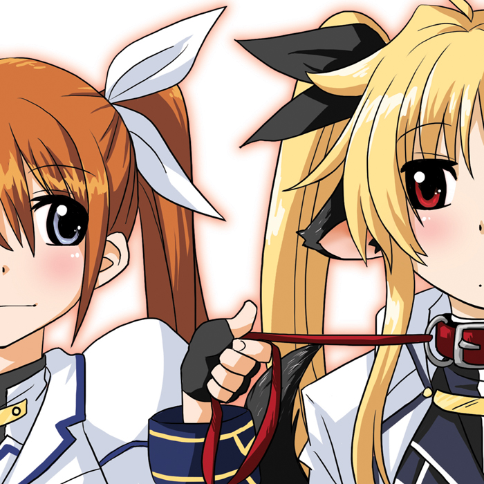 00s2girlsanimal earsblonde hairblue eyesblushbrown haircollarfingerless glovesgloveshair ribbonleashlong hairmultiple girlsred eyesribbontwintails