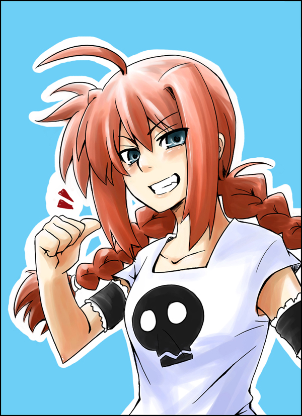 00s1girlahogearmbandblue eyesbraidfemale focusgrinlong hairred hairshirtskullsmilesolot-shirttwin braids