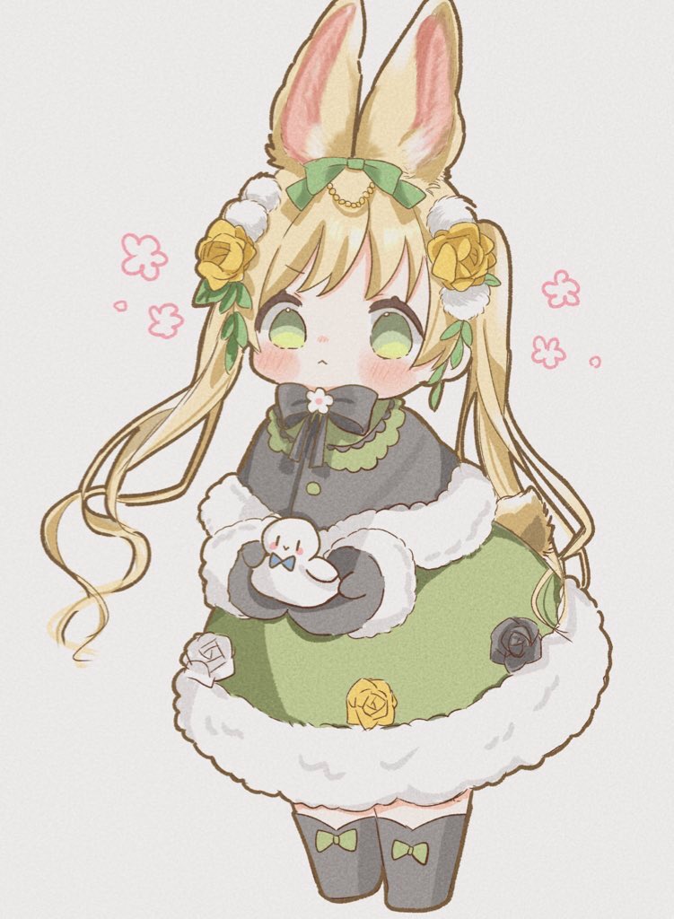 1boy1girladapted costumealternate costumeanimalanimal earsbirdblack bootsblack mittensblonde hairblushbootschibichibi onlycoatfull bodyfur trimfur-trimmed coatgreen coatgreen eyesholdingholding animalholding birdlong hairlooking at viewermittensmyua (wan wan 00xx)neck ribbonrabbit earsribbonsolostandingtwintailswinter clothes