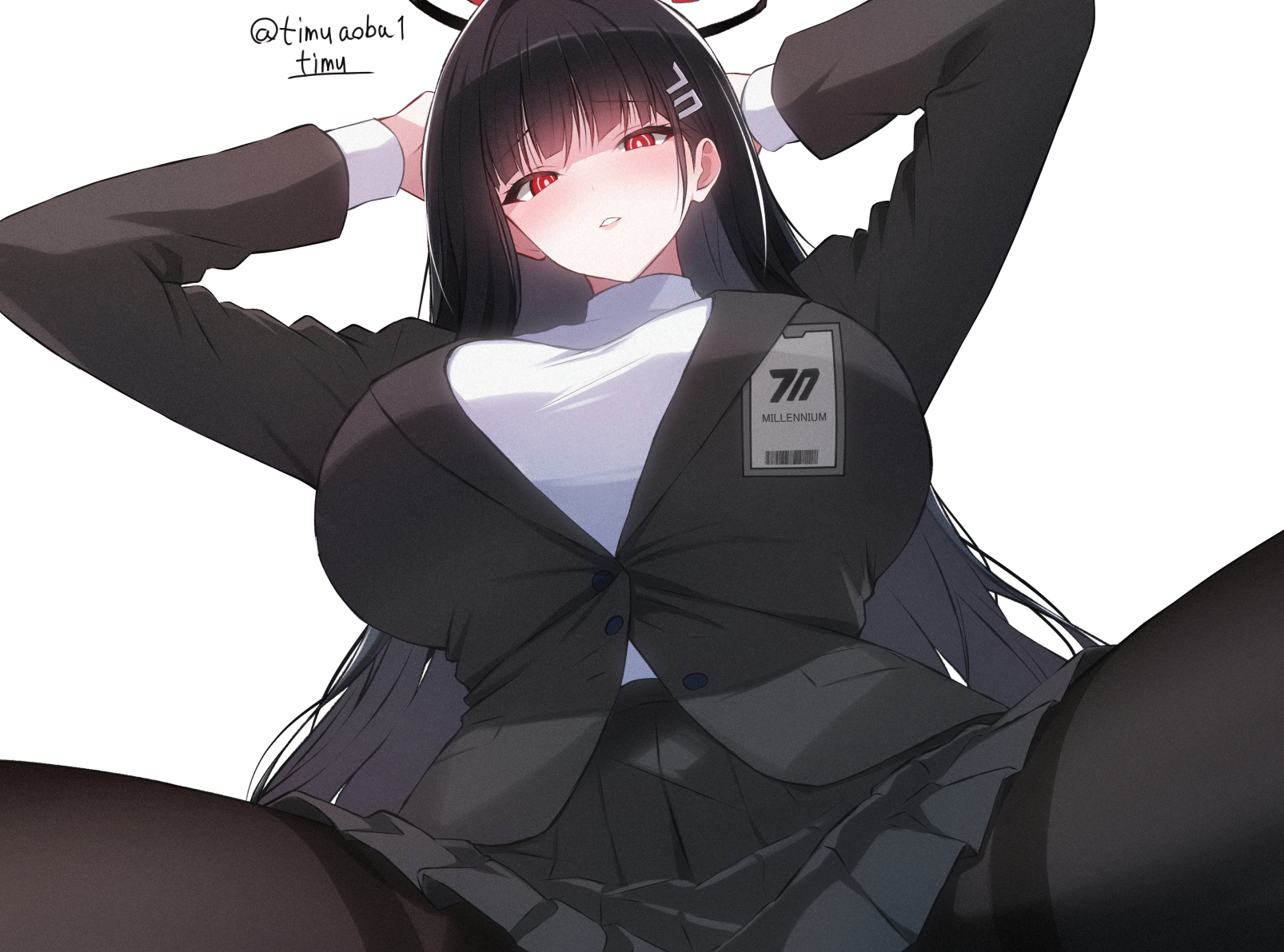 1girlarms upblack hairblack haloblack jacketblack pantyhoseblack skirtbreastshair ornamenthaircliphalojacketlarge breastslong hairlong sleeveslooking at viewername tagpantyhoseparted lipspleated skirtred eyesshirtsimple backgroundskirtsolospread legsturtleneckturtleneck shirtvery long hairwhite backgroundwhite shirt
