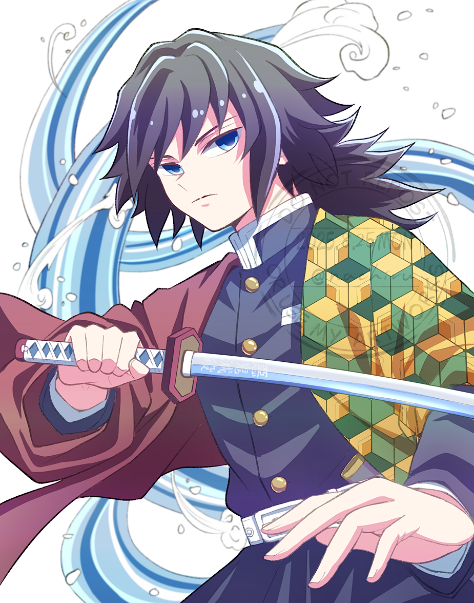 1boybeltblack hairblack jacketblack pantsblue eyesbuttonsclosed mouthdemon slayer uniformfuwarihirarigold buttonshand uphaorihigh collarholdingholding swordholding weaponjacketjapanese clotheskatanakikkoumonlooking at viewerlow ponytailmale focuspantsponytailprint haorired haorisolospiked hairswordwaterweaponwhite belt