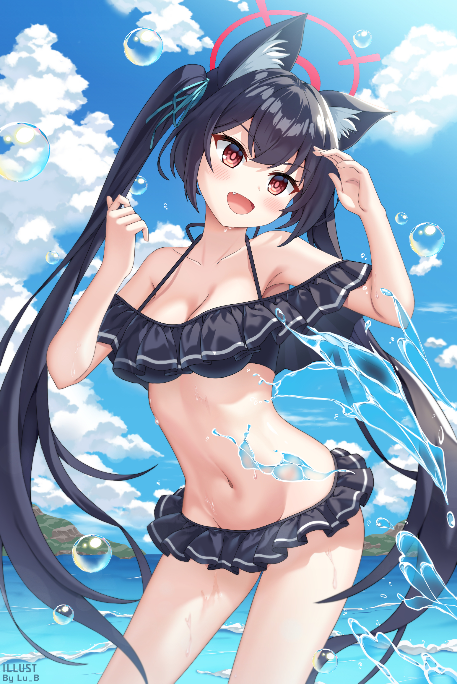 1girlanimal ear fluffanimal earsbeachbikiniblack bikiniblack hairblushbreastscat earsfangfox earsfrilled bikinifrillshalolong hairmedium breastsnaveloceanoff shoulderoff-shoulder bikiniofficial alternate costumeopen mouthred eyessolostomachswimsuittwintails