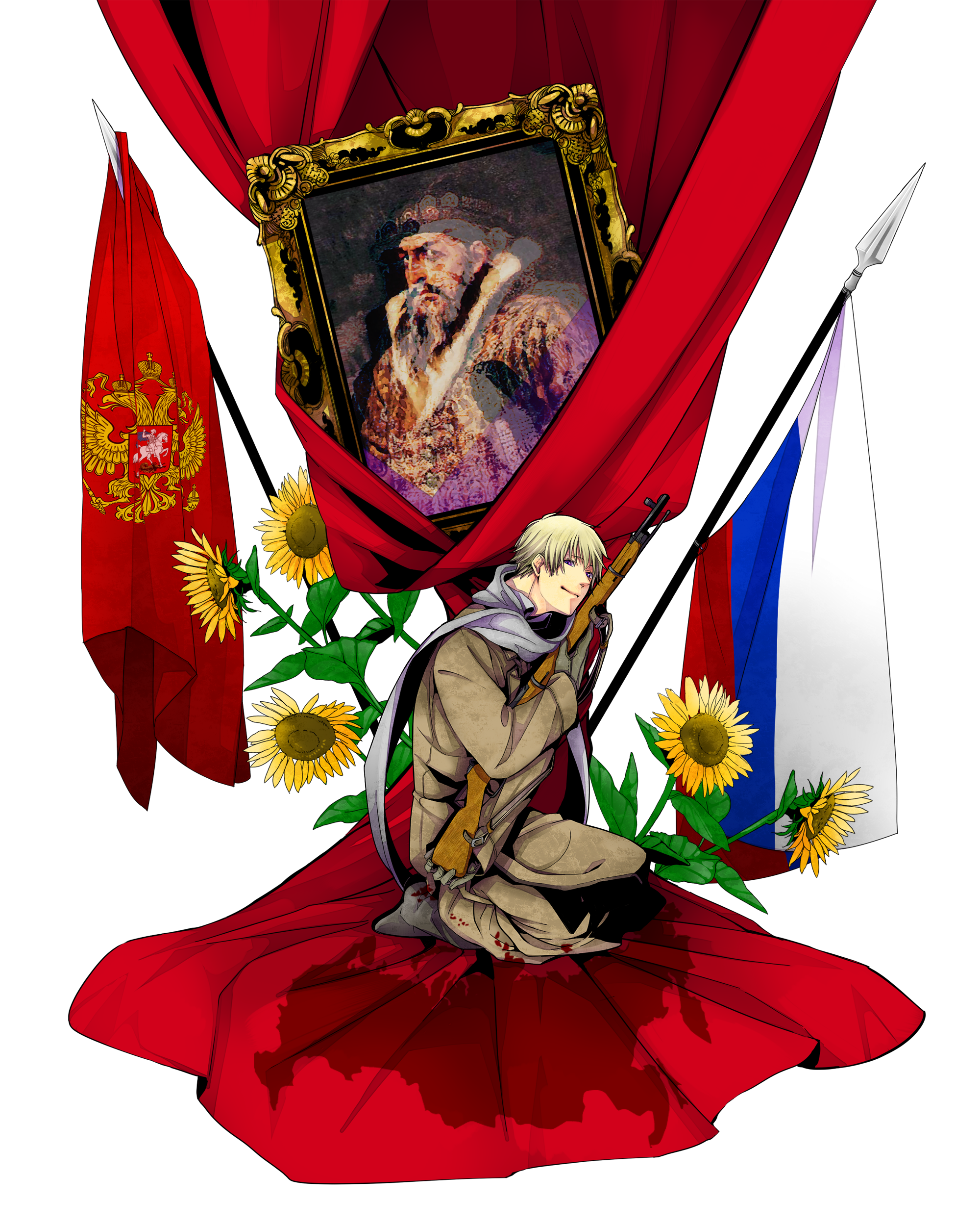 00s1boybeardblonde hairbloodbolt actioncoat of armsfacial hairflagflowergunmale focusmilitarymilitary uniformmosin-nagantportraitportrait (object)purple eyesriflerussiarussian flagscarfshort hairsolosunflowerweapon