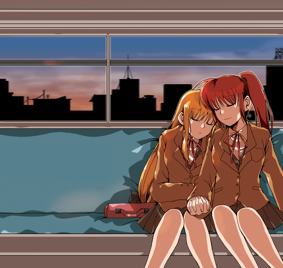 00s2girlsblonde hairbrown hairclosed eyescouplelong hairmultiple girlspencil skirtschool uniformside ponytailsittingskirtvery long hair