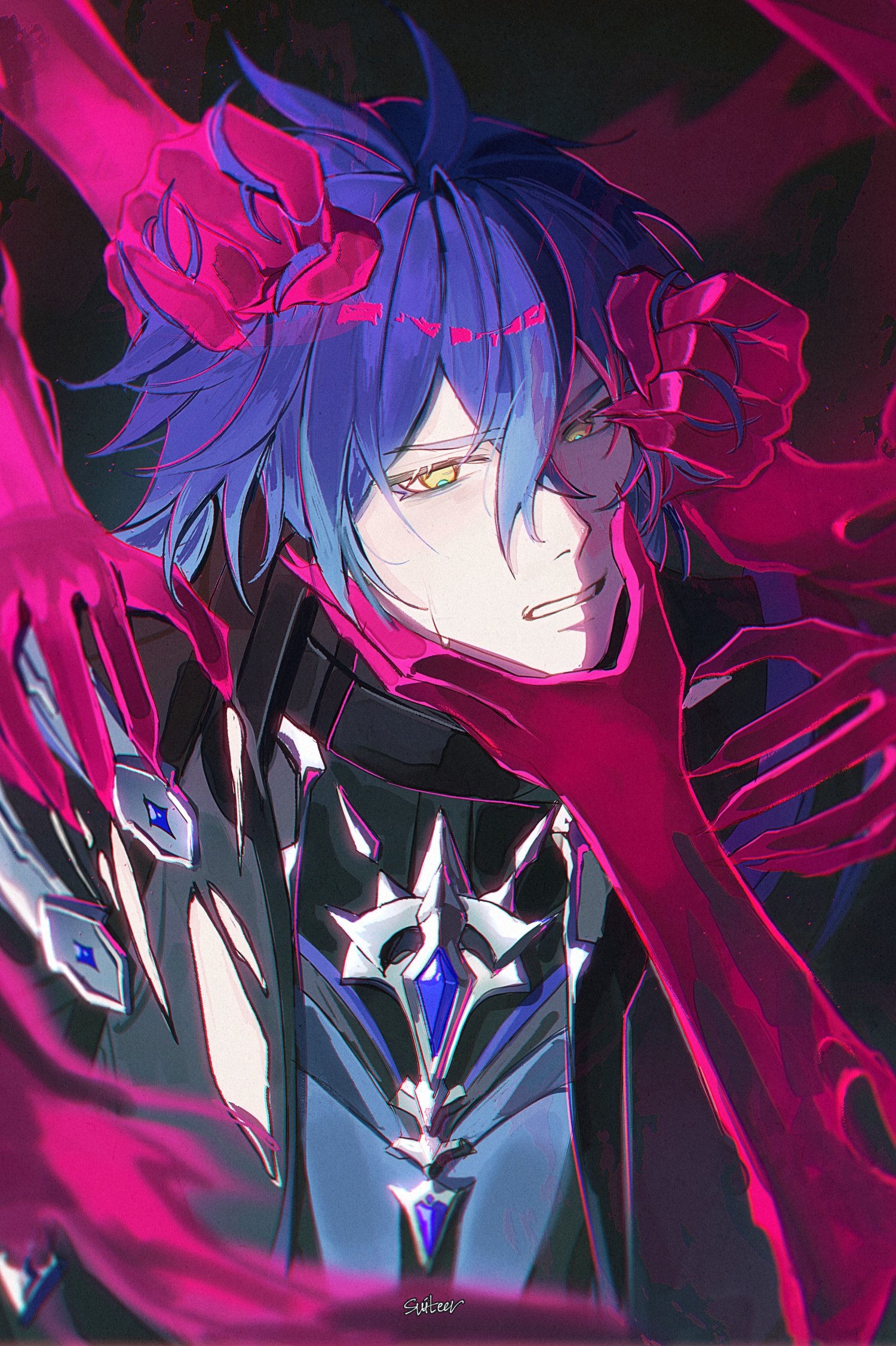 black coatblue hairclosed mouthcoatcollared coatcryinggrabbing another's hairgradient hairhair between eyeshand on another's faceholding another's hairlooking at viewermale focusmulticolored hairout of frametearsteethtwo-tone hairupper bodywhite hairyellow eyes