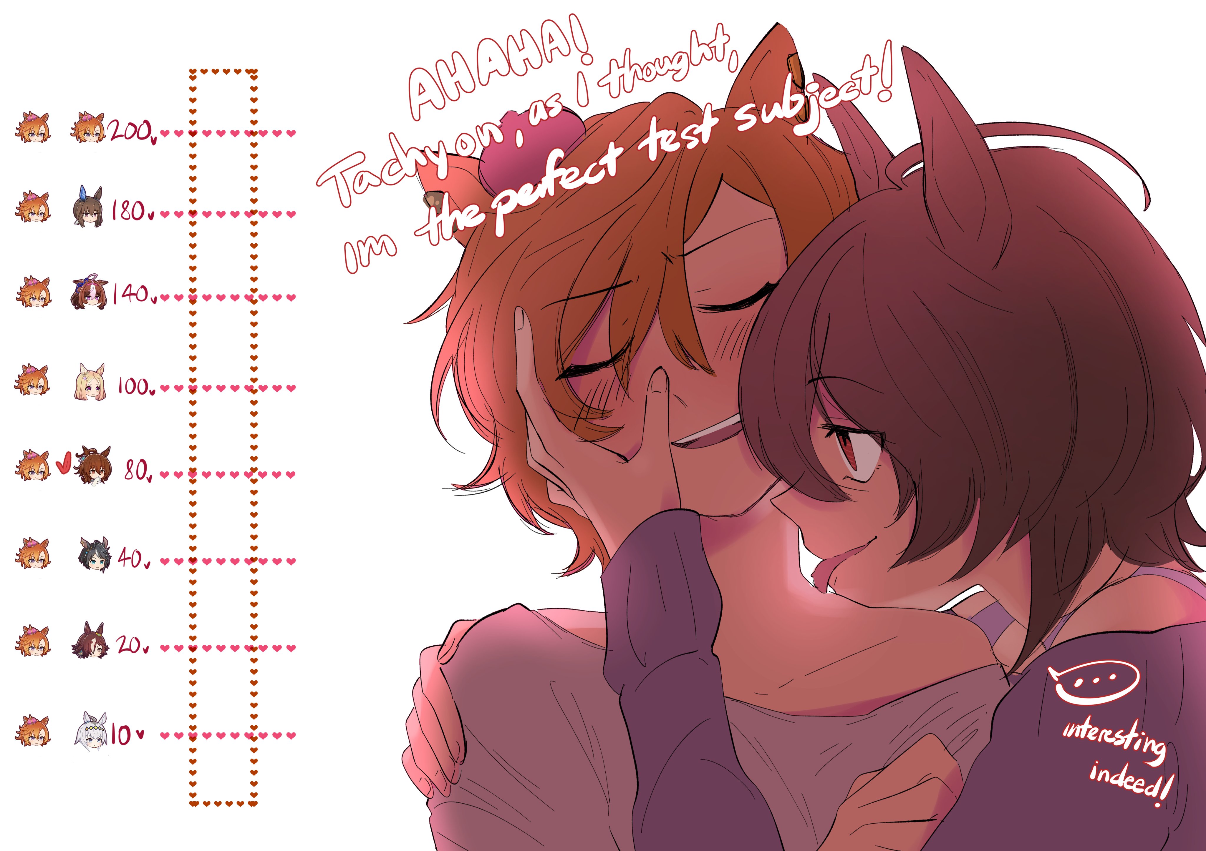 2girlsahogeanimal earsbacklightingblushbrown hairclosed eyescrosscrownenglish textgrey shirthand on another's facehand on another's shoulderhorse earshorse girlkiss meter (meme)lickinglicking another's necklong sleeveslooking at anothermememeo3mazemini crownmultiple girlsopen mouthorange hairpurple sweaterred crossred eyesshirtshort hairsmilesweaterwhite backgroundyuri