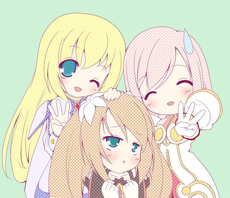 :t00s3girlsblonde hairbrown haircrossoverglovesgreen eyesin-franchise crossoverlong hairmultiple girlsone eye closedpink hairshort hairsimple backgroundsmilesweatdropwink