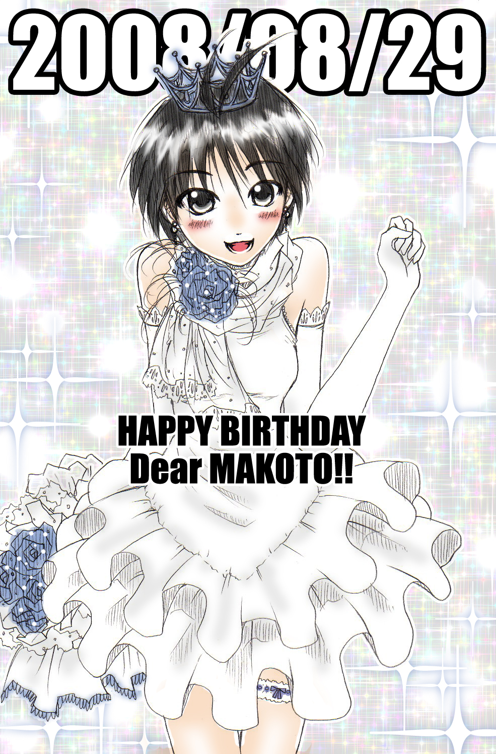 00s1girlantenna hairbirthdayblushbouquetcrowndresselbow glovesfemale focusflowerfrillsglovesshort hairsketchsolo