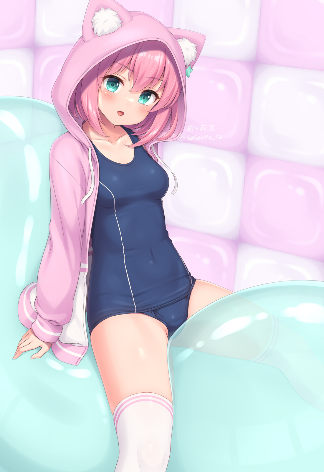 ini (inunabe00), kotonoha aoi, voiceroid, 1girl, bare shoulders, blue hair, blush, border, closed mouth, detached sleeves, dress, hand up, long hair, long sleeves, looking at viewer, outline, outside border, pink background, red eyes, see-through clothes, see-through sleeves, simple background, sleeveless, sleeveless dress, smile, solo, upper body, white border, white dress, white outline, white sleeves, wide sleeves