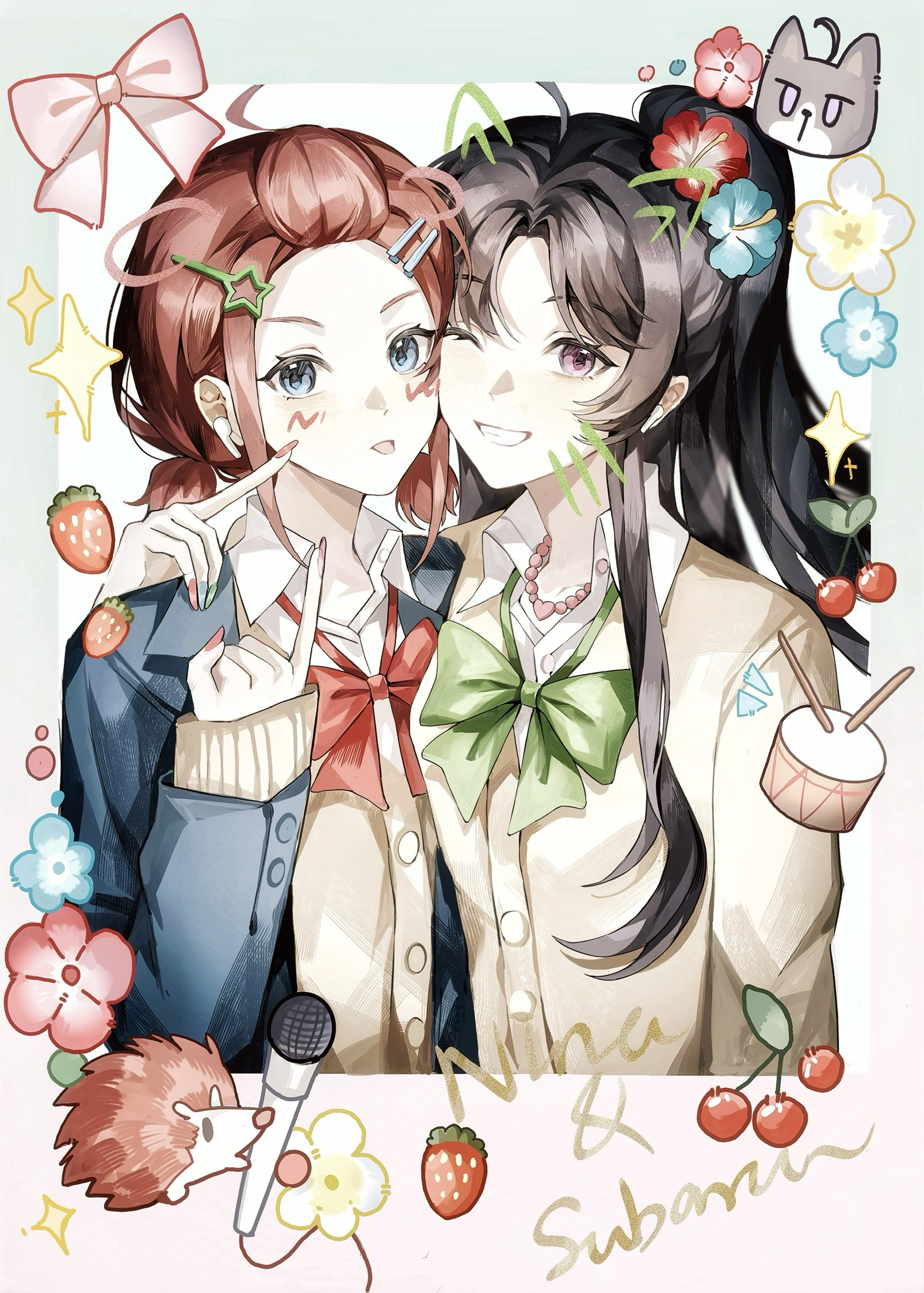 2girlsahogeblack hairblue eyesblue jacketblue nailsbowbowtiebrown cardiganbrown haircardigancharacter namecherryclosed mouthfoodfruitgreen bowgreen bowtiegreen nailshair ornamenthaircliphalf updohedgehogjacketlong hairlow twintailsmicrophonemultiple girlsnail polishone eye closedopen mouthparallel hairclipspurple eyesred bowred bowtiered nailsshort hairshort twintailstwintailsupper bodywhite background