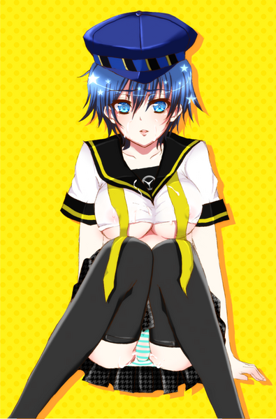 1girlblue eyesblue hairbreastscumcum on bodyfacialfemale focushatlarge breastsmatching hair/eyesnewsboy cappantiespantyshotschool uniformserafukushort hairsittingskirtsolostriped clothesstriped pantiesthighhighsunderboobunderwearupskirt