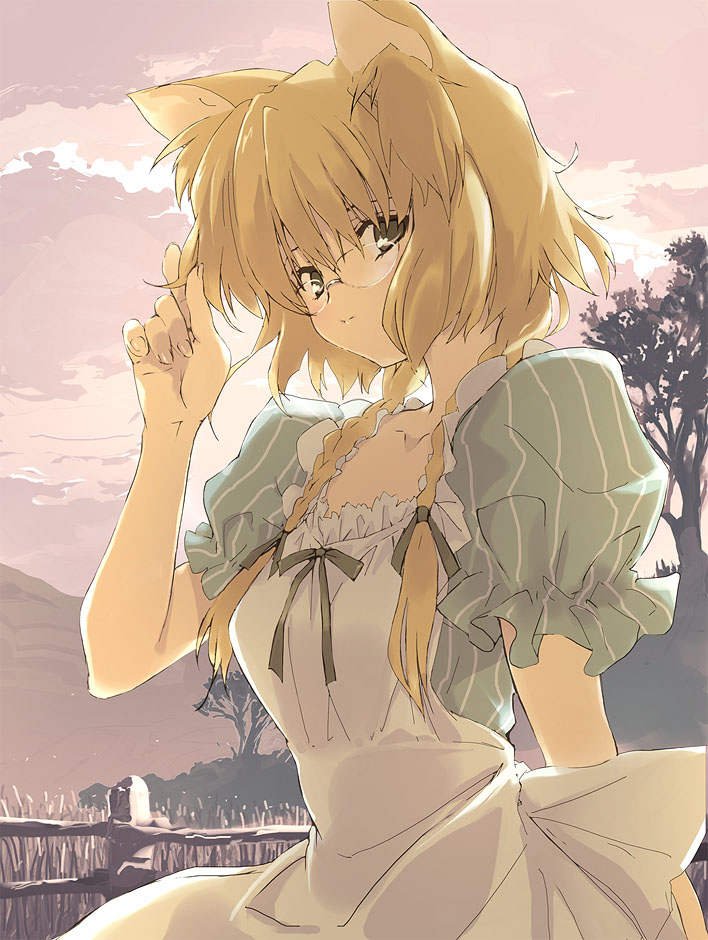 adjusting hairanimal earsblonde hairbowbraidbrown eyescat earsfenceglassesshort hairskysolotreetwin braids