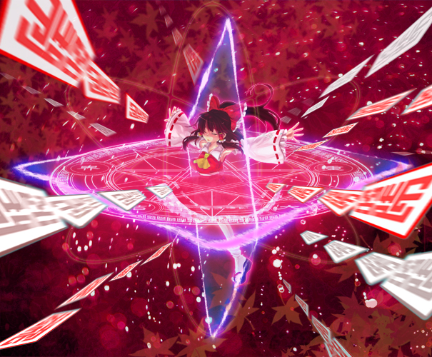 1girlarms at sidesascotblousebowbrown hairdanmakudetached sleevesfemale focushair bowjapanese clothesmagicmagic circlemikomotion bluroctagramofudaokobooutstretched armsplatform sandalsponytailred backgroundred shirtsandalsshirtsleevelesssleeveless shirtsolospread armsyellow ascot