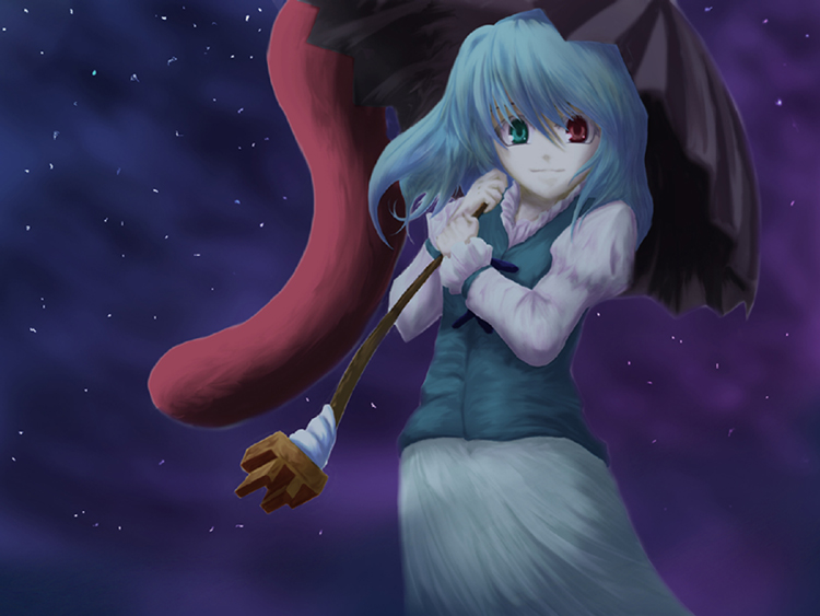 1girlblue hairfemale focusgreen eyesheterochromiakarakasa obakeoutdoorsred eyesskysmilesolostandingstar (sky)tongueumbrella