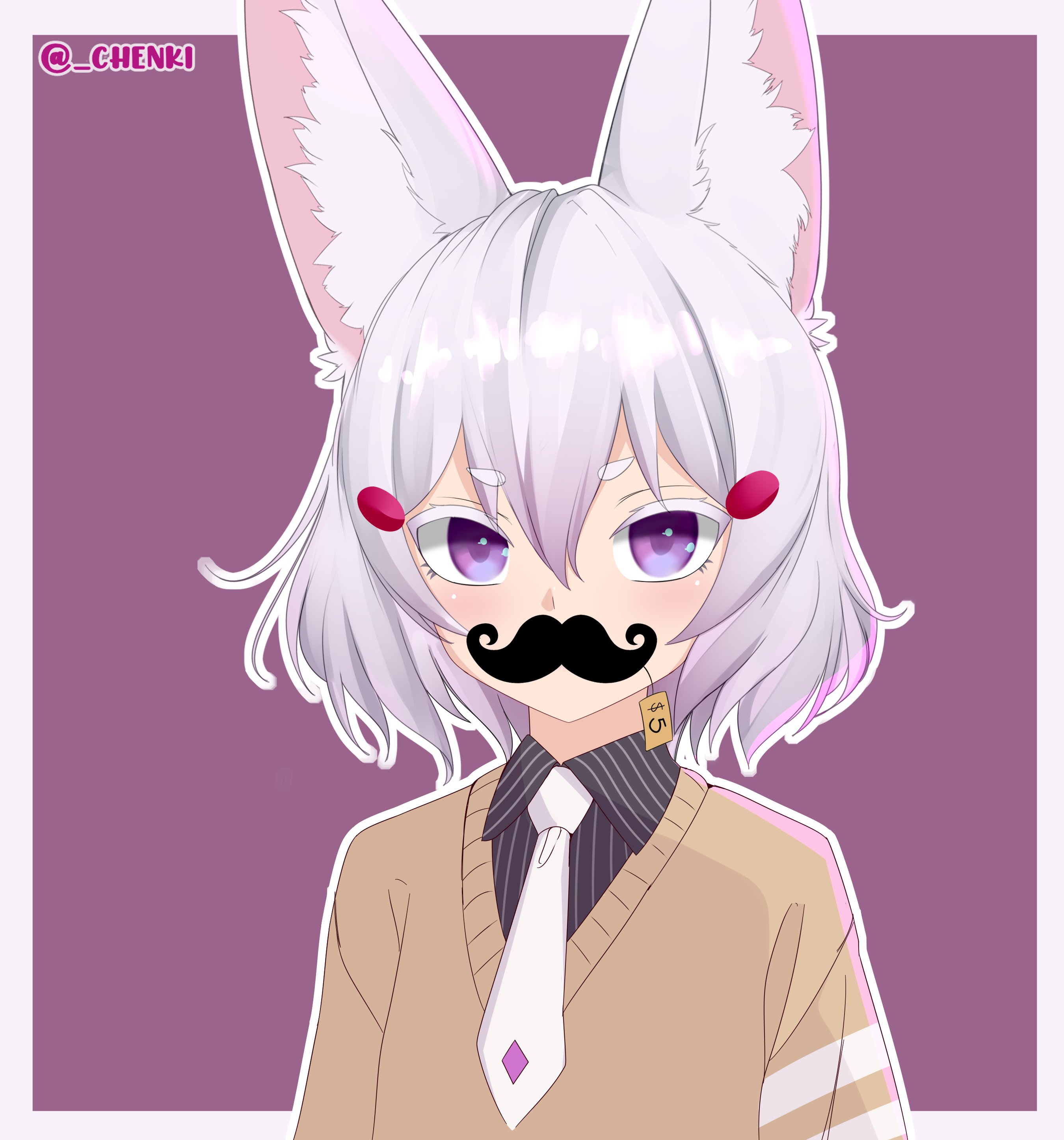 1girlanimal earsblack shirtbrown sweaterfake facial hairfake mustachefox earsfox girllooking at viewernecktieoutlineprice tagpurple backgroundpurple eyesshirtshort eyebrowsshort hairsimple backgroundsolostriped clothesstriped shirtsweaterthick eyebrowsupper bodyvertical-striped clothesvertical-striped shirtwhite hairwhite necktiewhite outline