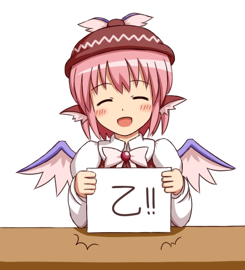 1girlanimal earsblushclosed eyesfemale focushatopen mouthpink hairsimple backgroundsittingsmilesolowhite backgroundwings