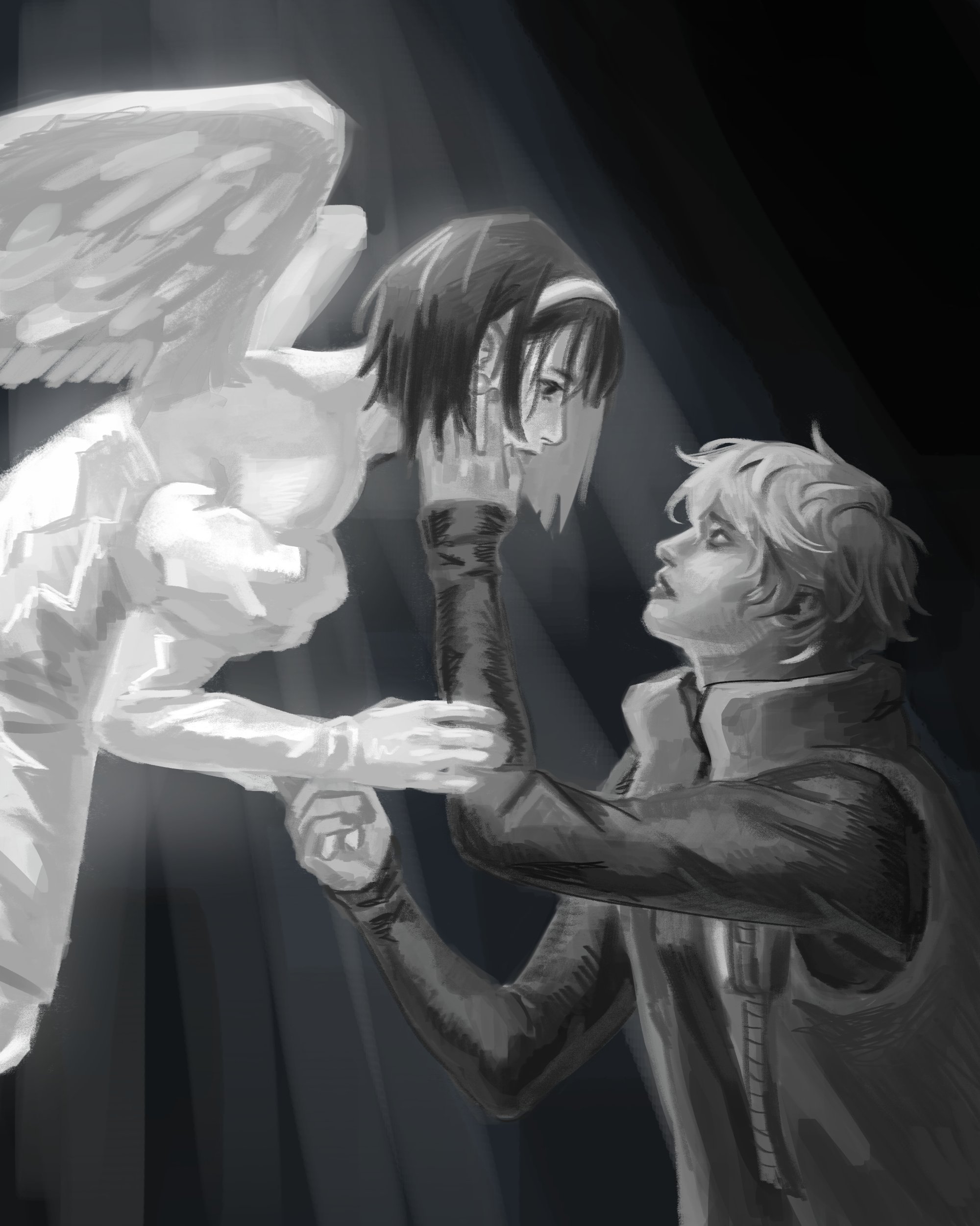 2girlsangel wingsdressearringselbow glovesglovesgreyscalehairbandhand on another's facejewelryjuliet sleeveskureomelong sleevesmonochromemultiple girlsoff shoulderoff-shoulder dresspuffy sleevesshirtshort hairvery short hairvestwings