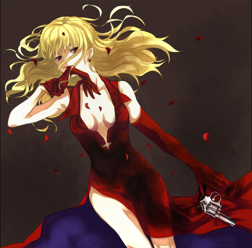 1girlblonde hairbreastscleavageelbow glovesfemale focusglovesgunhandgunopen clothesopen shirtrevolvershirtsoloweapon