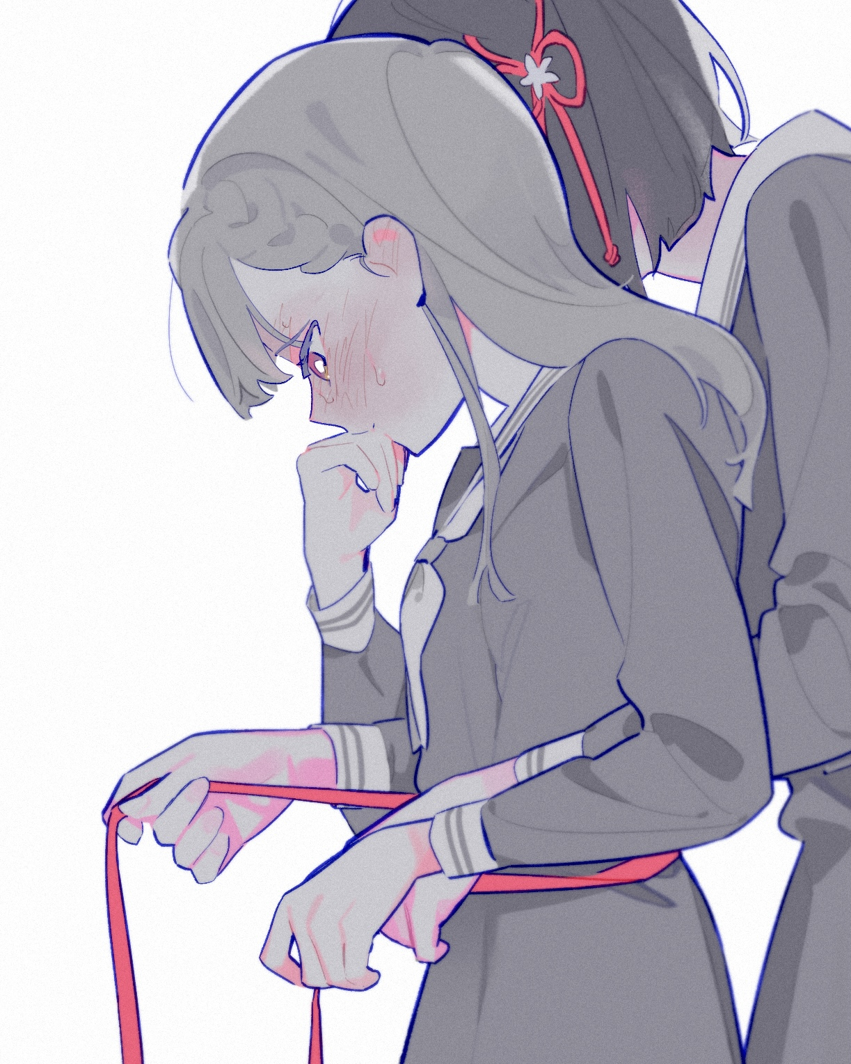 2girlsblushdressear blushgreyscalehasu no sora school uniformholdingholding tape measurehughug from behindlong hairlong sleevesmeasuringmonochromemultiple girlsneckerchiefpink eyespink ribbonribbonsailor dressschool uniformshort hairspot colorsweattape measurewinter uniformyuri