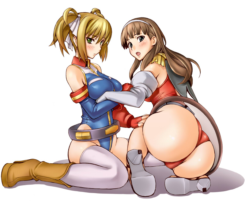 2girlsassbeltbelt skirtblonde hairbrown hairelbow glovesglovesgreen eyeshighleghighleg leotardhuge assleotardmultiple girlsthighhighsthong leotard