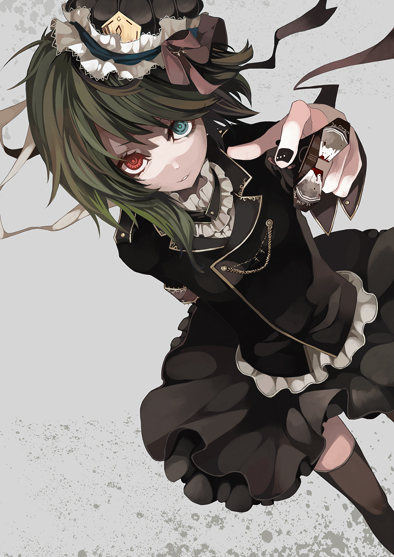 1girlalternate costumeblack nailsblue eyesdutch anglefemale focusgreen hairhatheterochromianail artnail polishoutstretched armred eyesribbonshort hairsolothighhighs