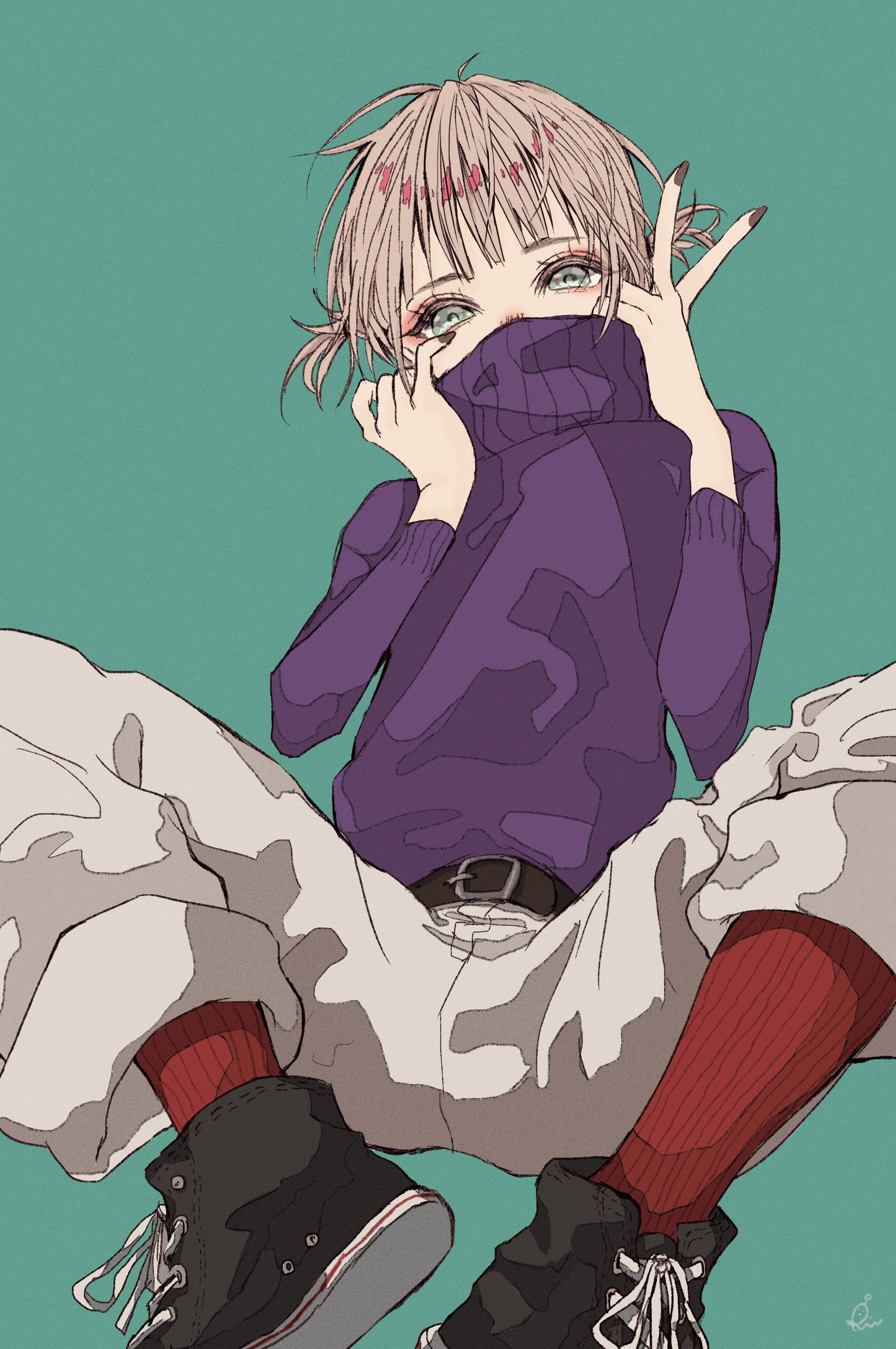 1girlaqua backgroundbeltblack beltblack shoesbrown haircovering own mouthcowboy shoteyeshadowgreen eyesgrey nailsknees uplong sleeveslooking at viewermakeuppantspurple sweaterred eyeshadowred socksrin (rinchoco91)shoesshort hairshort twintailssimple backgroundsneakerssockssolosweaterturtleneckturtleneck sweatertwintailsvwhite pants