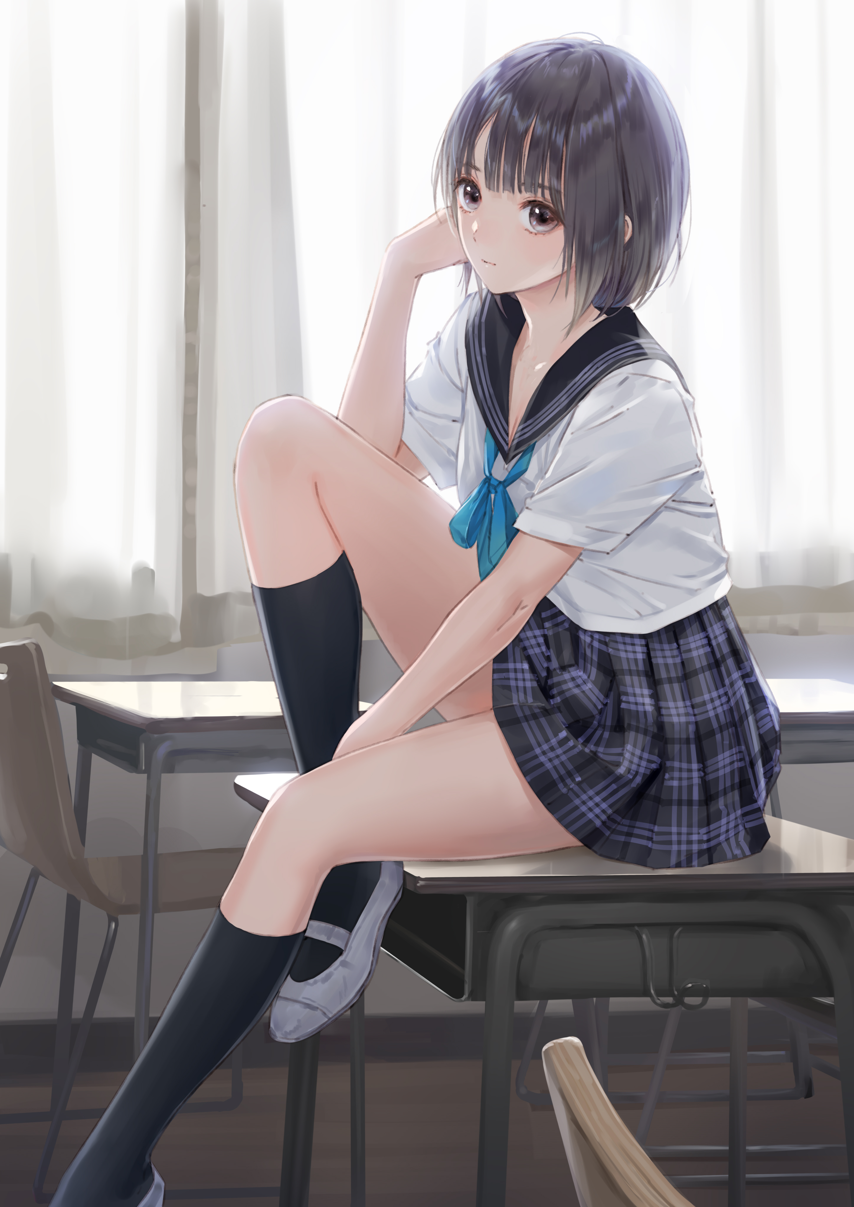 1girlblack socksblue bowblunt bangsbob cutbowbrown eyesclassroomcurtainsdeskhand on own facehoshinomiya girls' high school uniformindoorskneehighslooking at viewerno dickeyon deskpleated skirtschool deskschool uniformserafukushoesshort hairsittingskirtsockssolothighsuwabakiwhite shoeswindow