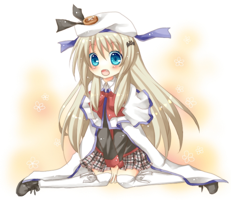 blonde hairblue eyescapefanghatlong hairplaid clothesplaid skirtschool uniformskirtsolothighhighs