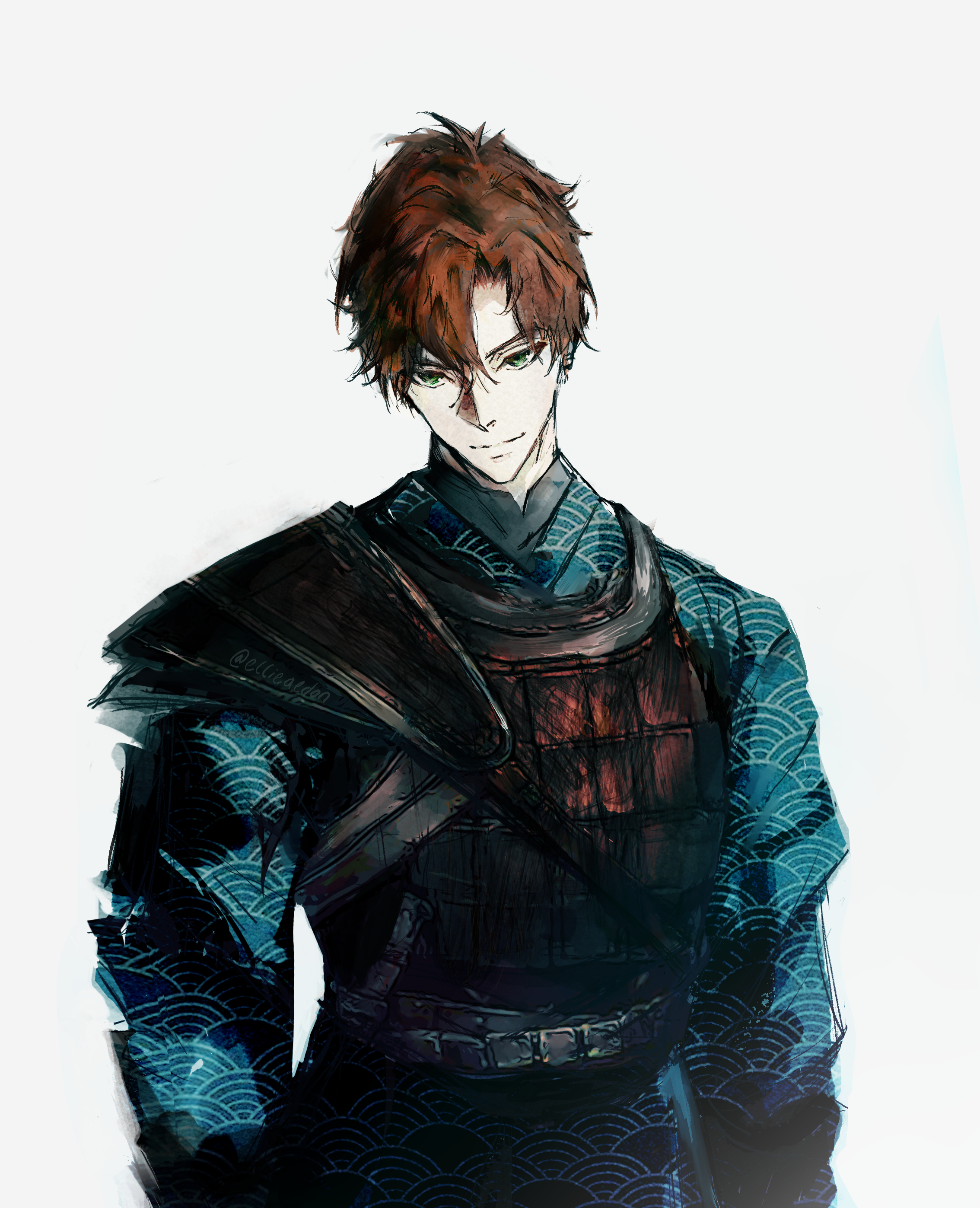 1boyarmorblue eyesbrown haircowboy shotcurtained hairhead tiltlooking at viewermale focusnight (shadow slave)short hairsingle shoulder padsmirksolowave print
