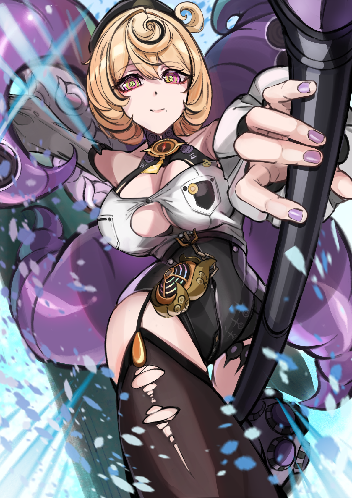 1girlberetblack thighhighsblonde hairbreastsbrown thighhighscleavagecleavage cutoutclothing cutouthatholdinglarge breastsmolemole under mouthnail polishpurple nailsshirtshort hairsmilesolostafftentaclesthighhighstorn clothestorn thighhighsuser yerf5583weaponwhite shirt