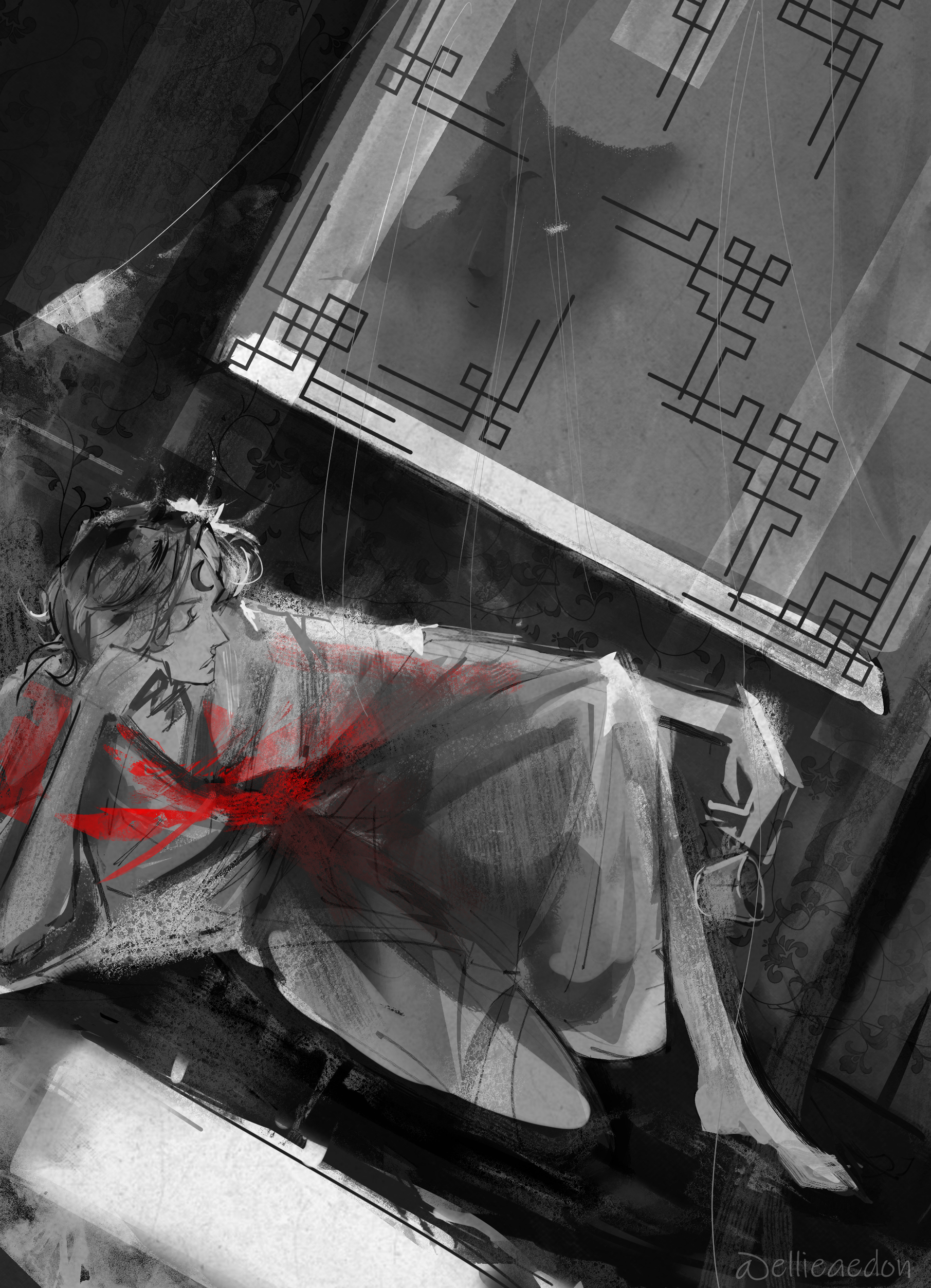 1boybarefootbloodblood splatterclosed eyescrescentcupcurtainsdutch angleelbow on kneefacial markforehead markfull bodyhand on own chinhand uphead restholdingholding cupknee uplyingon sidepartially coloredrobeshort hairsolowindow light