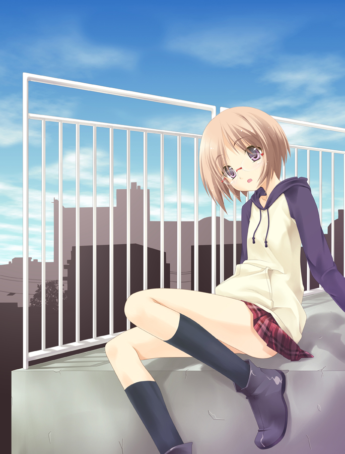 1girlblack socksbrown hairfemale focusglasseskneehighsred-framed eyewearrooftopskirtsockssolosweater