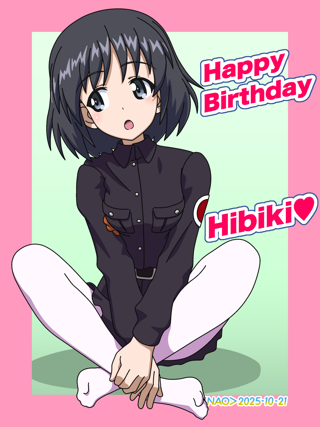 1girlbirthdayblack hairblue eyesblushbreastscharacter namedatedgreen backgroundhappy birthdayjapanese tankery league judge uniformopen mouthpantyhoseshort hairsignaturesimple backgroundsmall breastssolowhite pantyhose