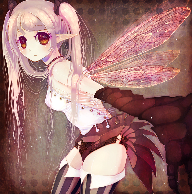 1girlbreastschokerfairyfemale focusinsect wingslong hairmedium breastspink hairpointy earsred eyessolostriped clothesstriped thighhighsthighhighswings