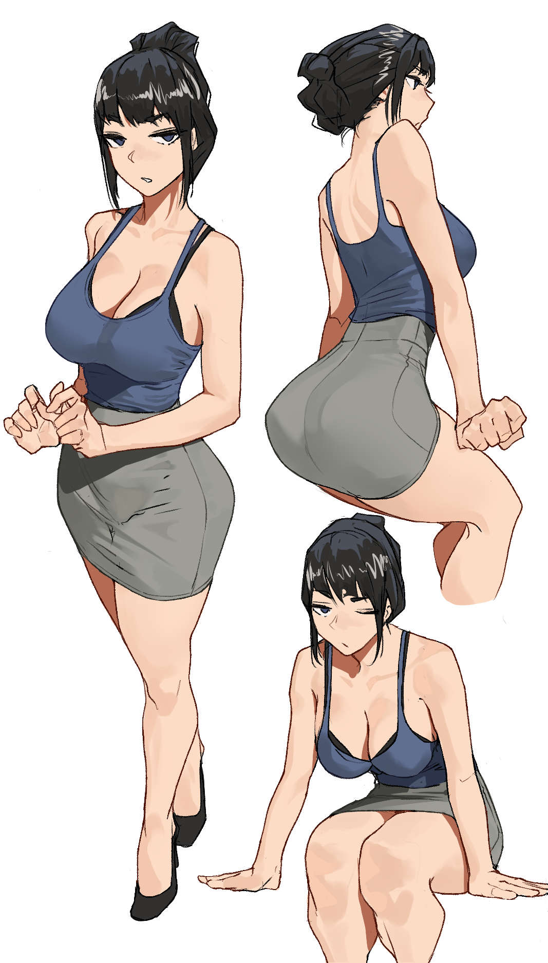 1girlassblack hairblue camisoleblue eyesbrabreastscamisolecleavagelarge breastsmedium hairsimple backgroundskirtunderwearwhite background