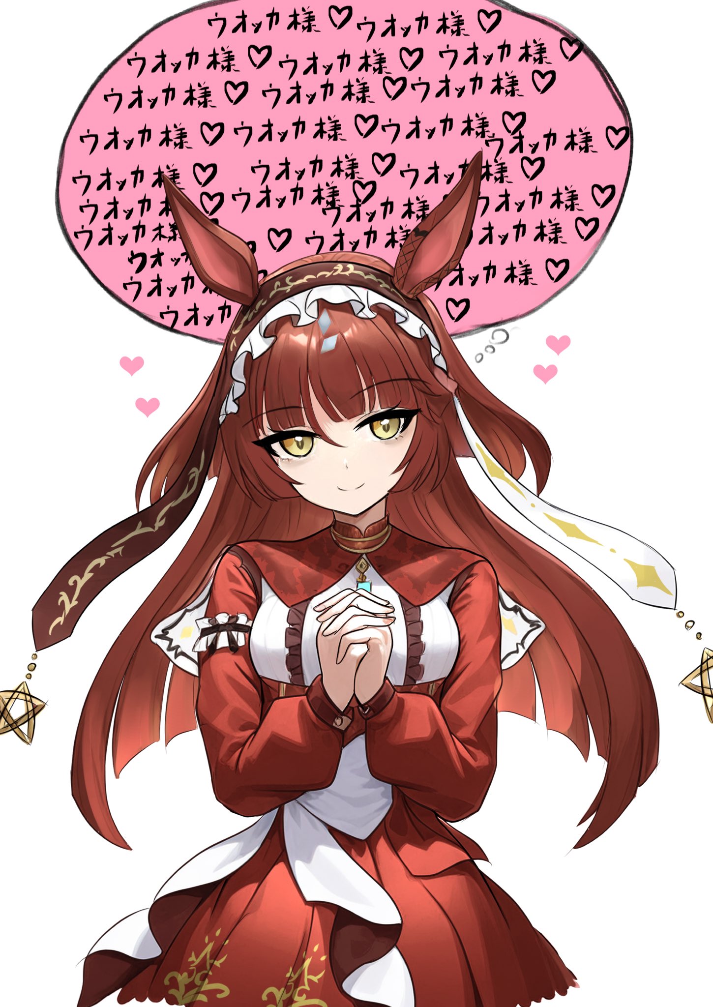 1girlanimal earsbrown hairbandclosed eyesdresshairbandhearthorse earshorse girllong hairlong sleeveslooking at viewerown hands claspedown hands togetherred dressred hairsimple backgroundsmilesolospeech bubblethought bubblewhite backgroundyellow eyes