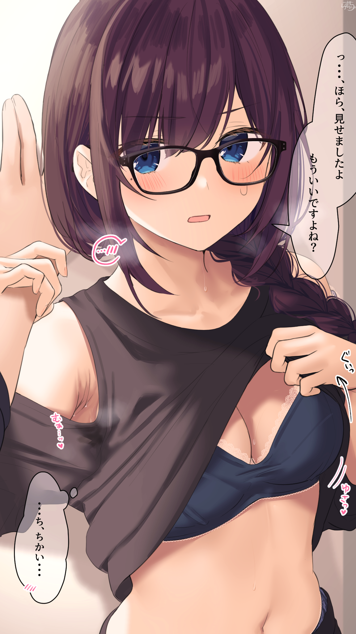armpit creaseblack-framed eyewearblue brablue eyesblushbrabraidbreastscleavageclothes liftclothing cutoutcollarbonekabedonlifting own clotheslight frownlooking at viewermotion linesnavelparted lipspovpurple hairshirt liftshoulder cutoutsidelocksspeech bubblespoken blushsteamstomachsweatsweatdropswept bangsthought bubbleunderwear