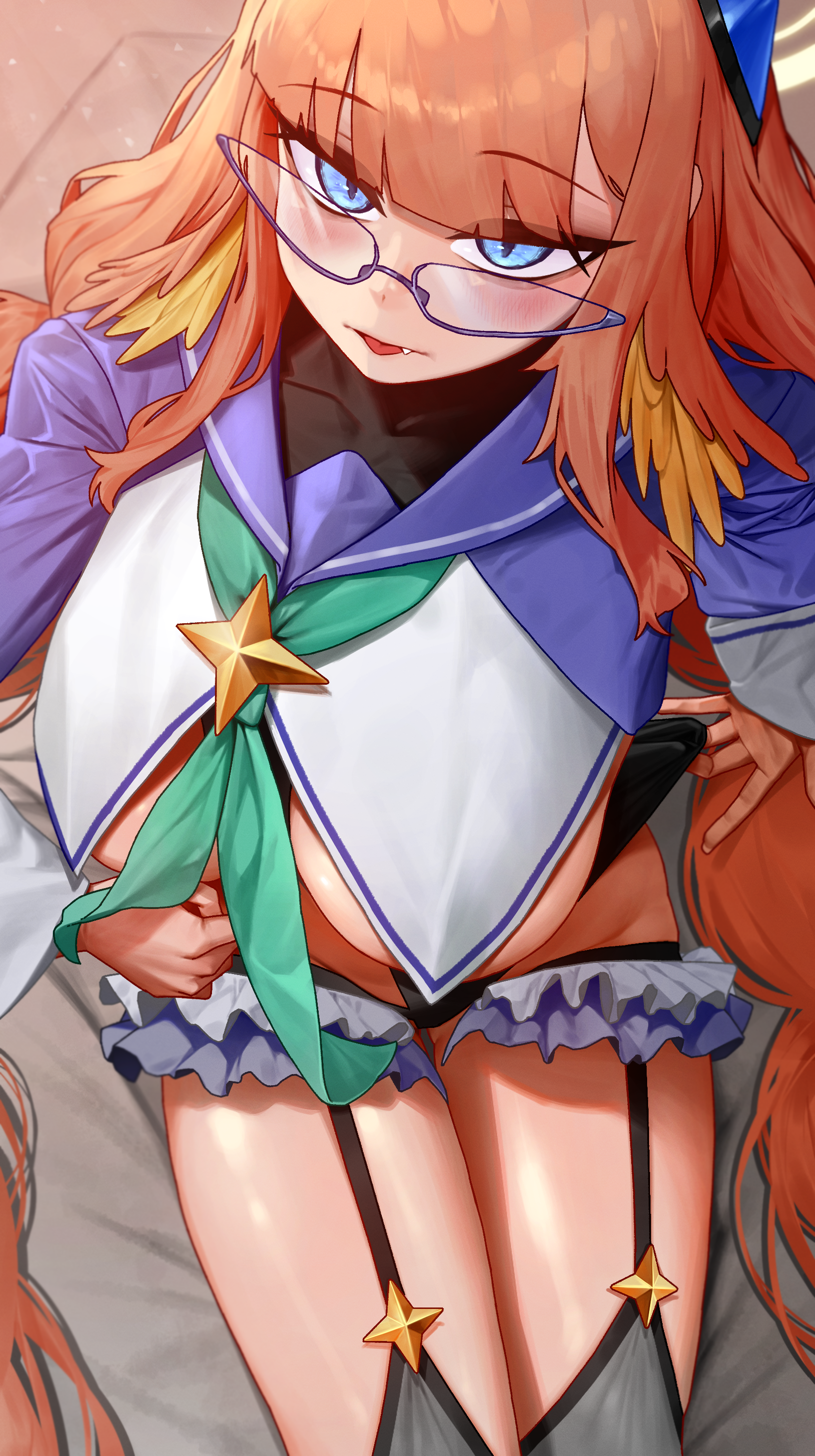 1girlblue eyesblushbreast curtainsbreastsfangfeather hairglassesgreen neckerchiefhuge breastslong hairlooking at viewerneckerchiefofficial alternate costumeopen mouthorange hairpurple sailor collarsailor collarshirtsidelockssolothigh strapwhite shirt