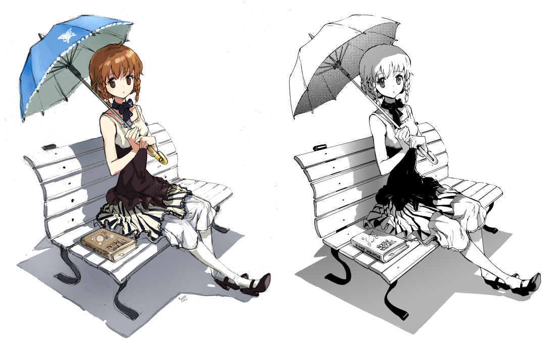 2girlsanimal printbare armsbare shouldersbenchblack dressblack ribbonblack shoesblue umbrellabookbraidbraided sidelocksbrown eyesbrown hairbutterfly printdressdual personaetolie granchefrilled dressfrillsgreyscalehalftonehigh heelsholdingholding umbrellalayered skirtlooking at viewermonochromemultiple girlsneck ribbonon benchplatonic supernovaprint umbrellaribbonshadowshirtshoe solesshoesshort hairsidelockssittingskirtstriped clothesstriped skirtumbrellaunderbustwhite shirtwhite skirtwooden bench