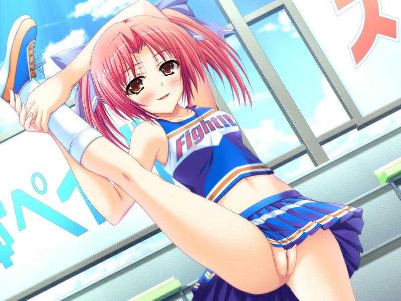 1girlarmpitsarms upblushcheerleaderdutch anglefemale focusleg liftmidriffno pantiespussyred hairshort hairskirtsockssolostandingstanding on one legtwintailsuncensored