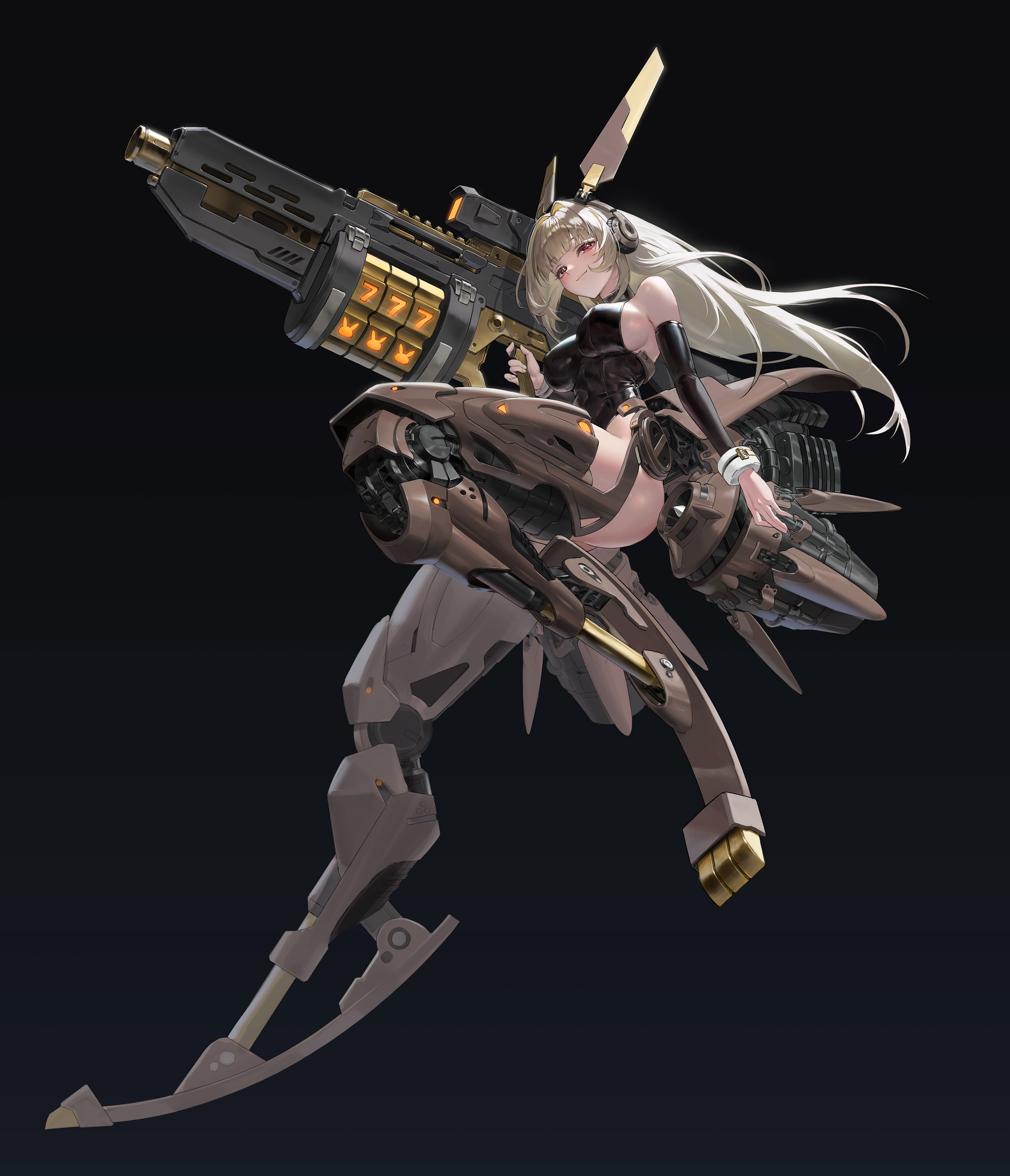 1girlbare shouldersblack backgroundblack leotardblack sleevesblonde hairblunt bangsbreastsclosed mouthdetached sleevesfull bodygradient backgroundholdingholding weaponlarge breastsleotardlong hairlooking at viewermechanical legsred eyessmilesolothighsvery long hairweapon