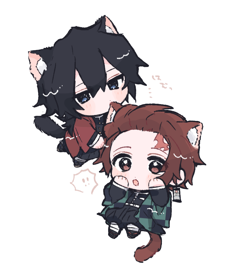 2boysanimal earsbeltblack hairblack jacketblack pantsblack socksblue eyesbrown hairbuttonscat boycat earscat tailcheckered haorichibichibi onlydemon slayer uniformfull bodyg nyan tgold buttonshaorihigh collarjacketjapanese clotheslow ponytailmale focusmultiple boyspantsponytailred haorisandalssimple backgroundsocksspiked hairtailwhite backgroundwhite belt