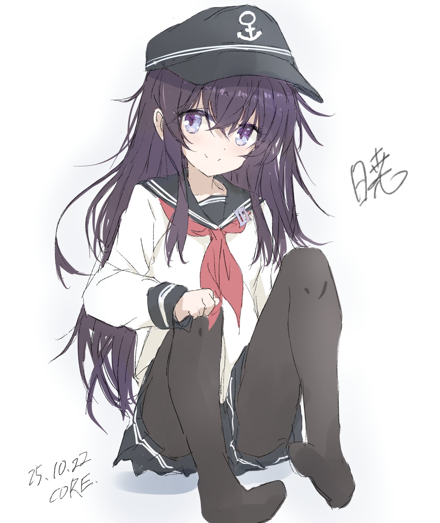 1girlanchor symbolartist nameblack hairblack pantyhoseblack sailor collarblushdatedflat caphatlong hairlong sleeveslooking at viewerneckerchiefpantyhosepleated skirtpurple eyespurple hairred neckerchiefsailor collarschool uniformserafukusittingskirtsmilewhite background