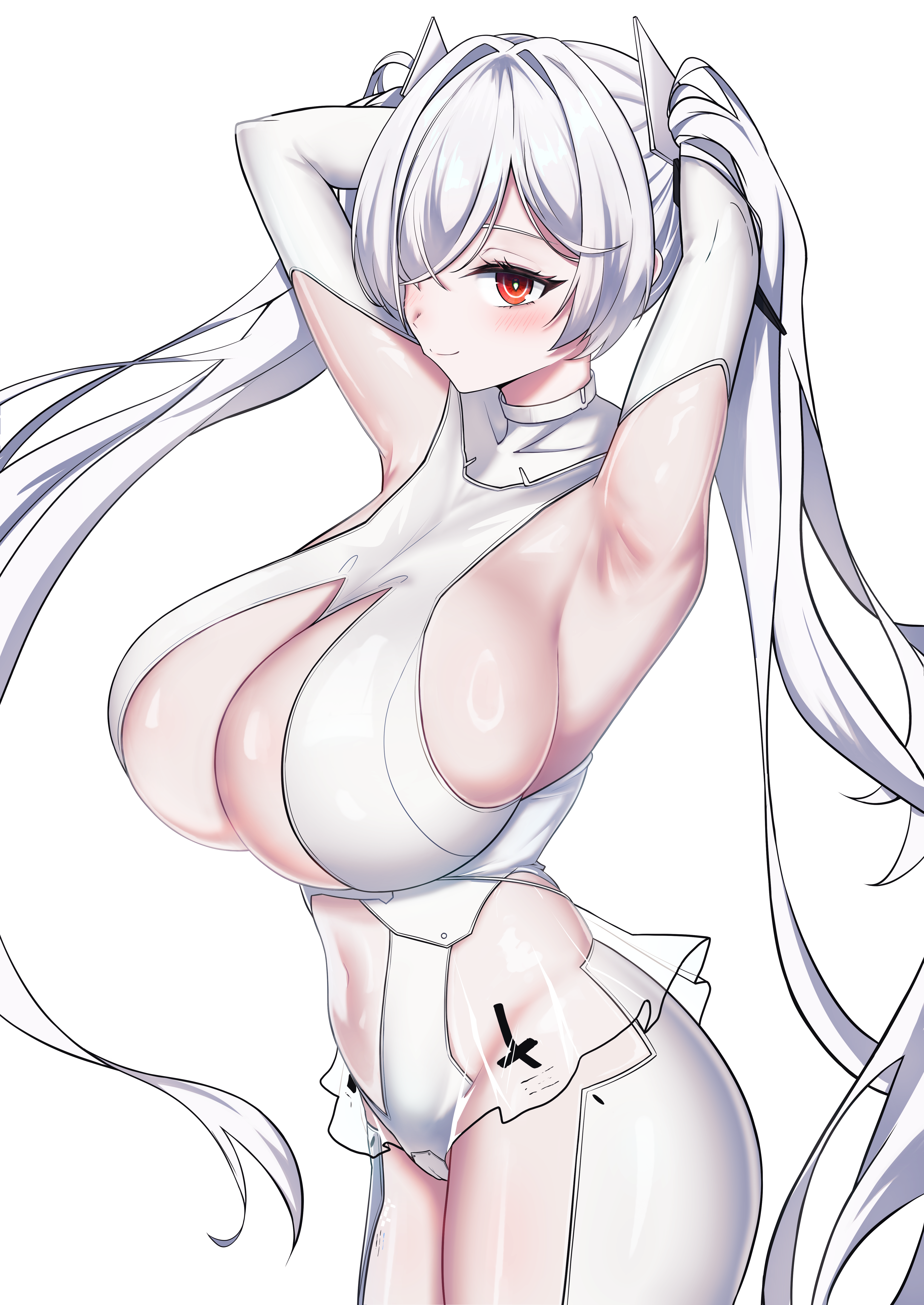 1girlarmpit cutoutbodysuitbreastsclothing cutouthair over one eyelarge breastsleg cutoutnavel cutoutone eye coveredsee-through bodysuitsee-through clothessee-through skirtskirtsolostomach cutoutwhite bodysuit